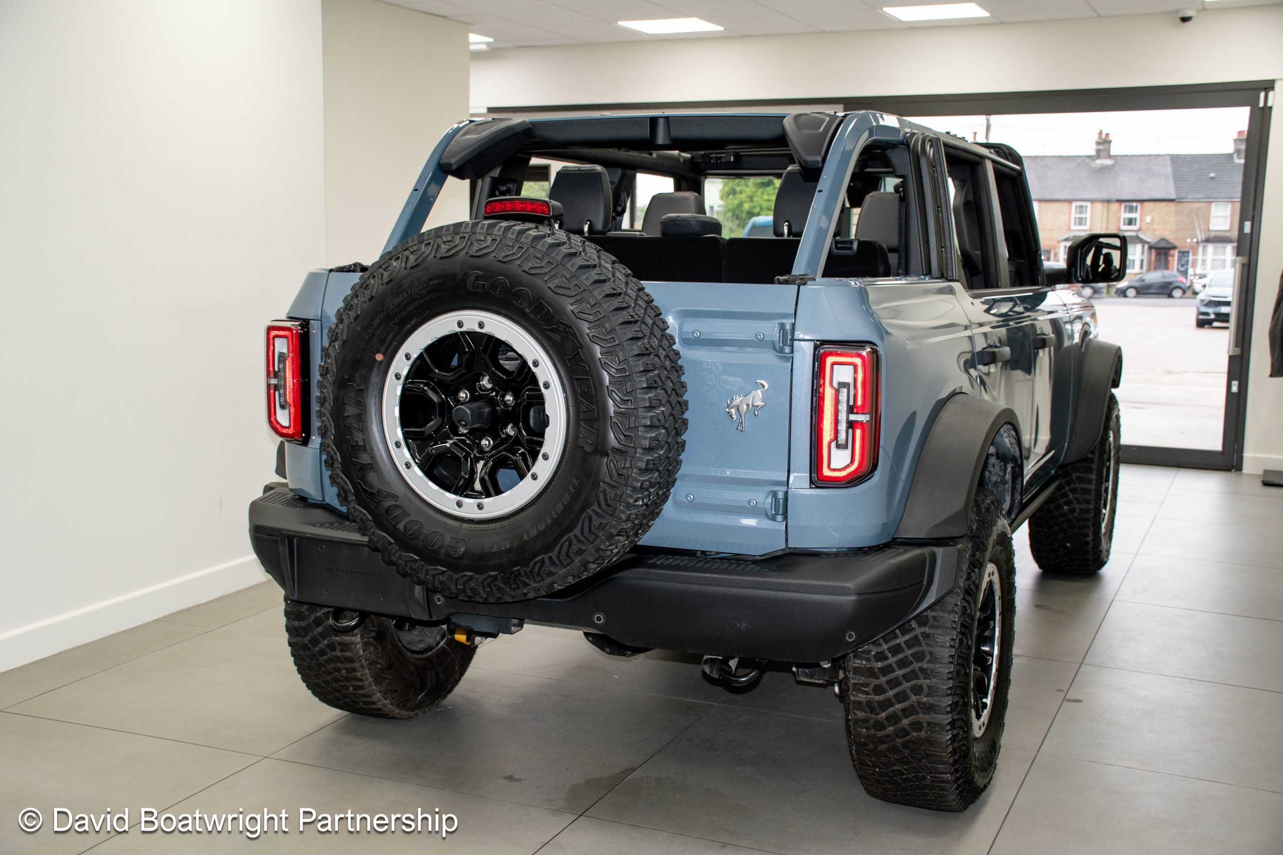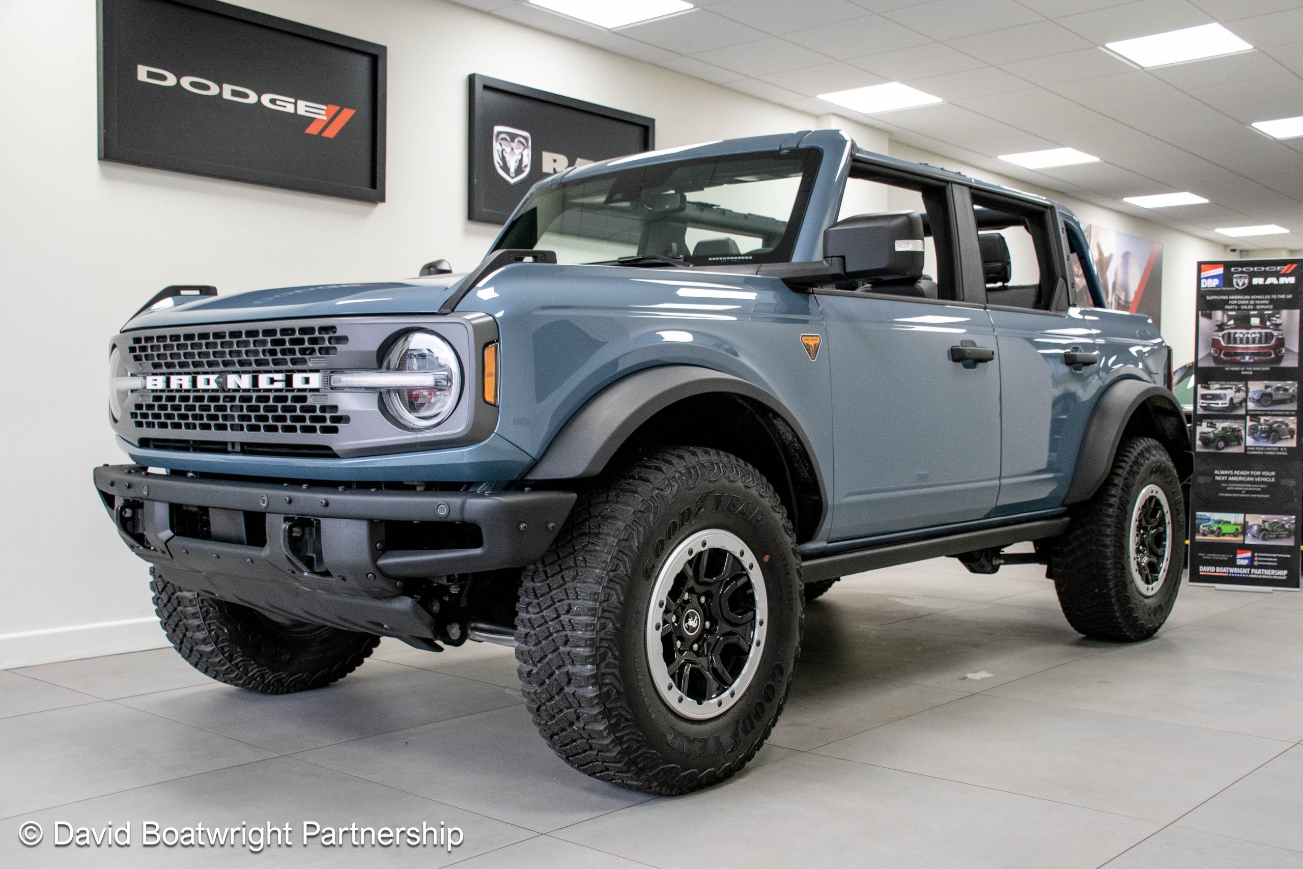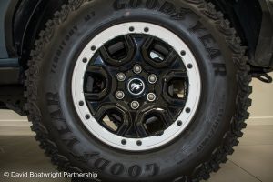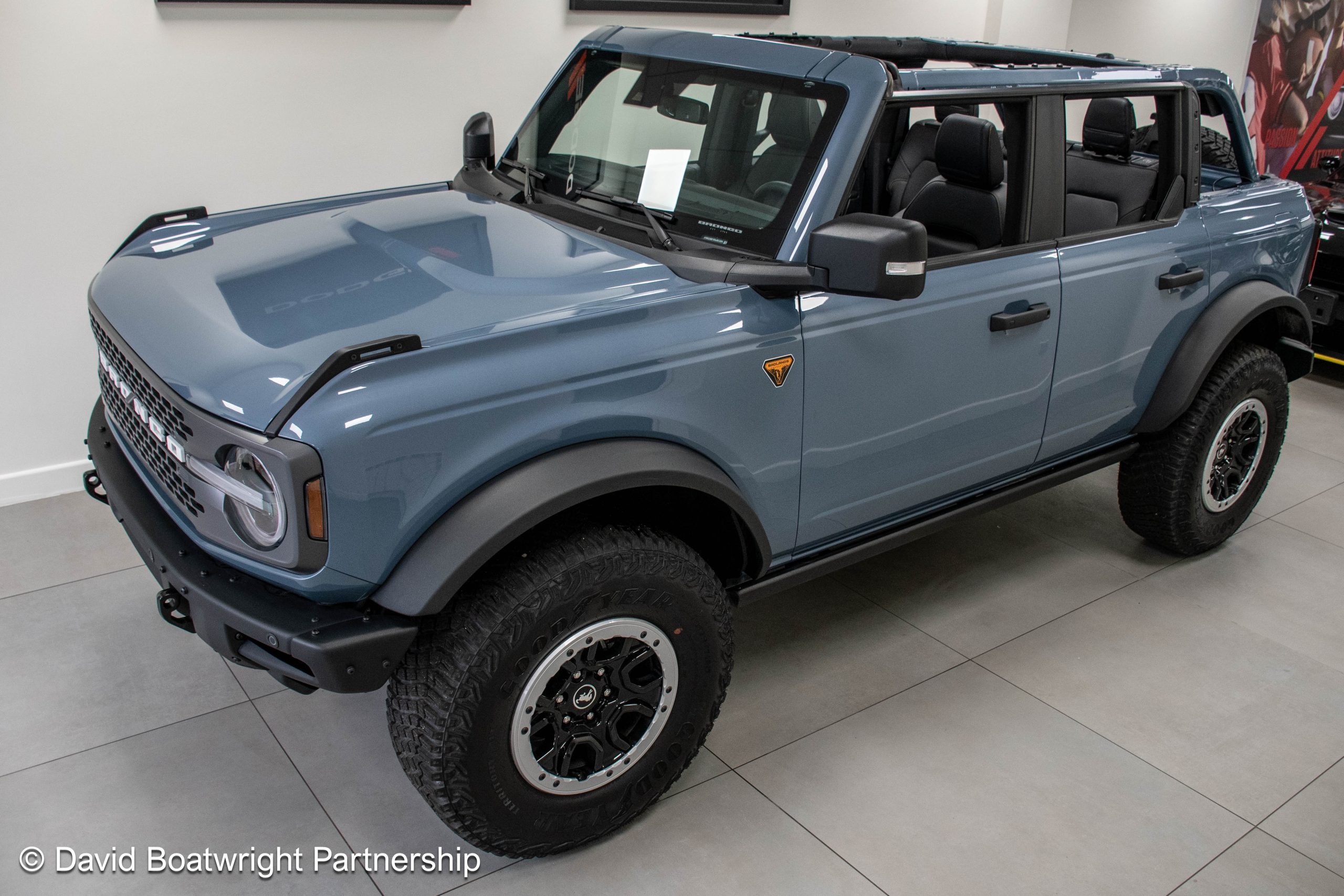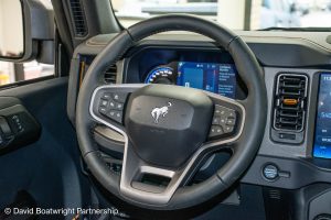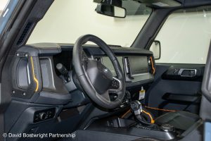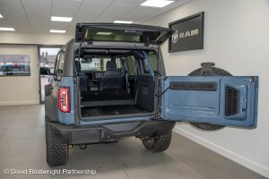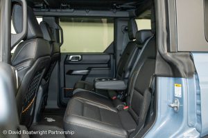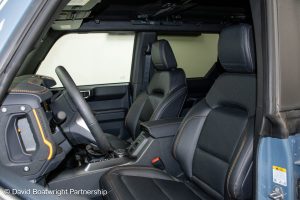 The Ford Bronco Badlands comes complete with fully removable roof and storage bags, finished in metallic Azure Grey & Black Onyx vinyl interior.