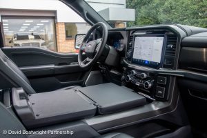 Mobile office package including console worksurface, lockable rear storage & wireless charging